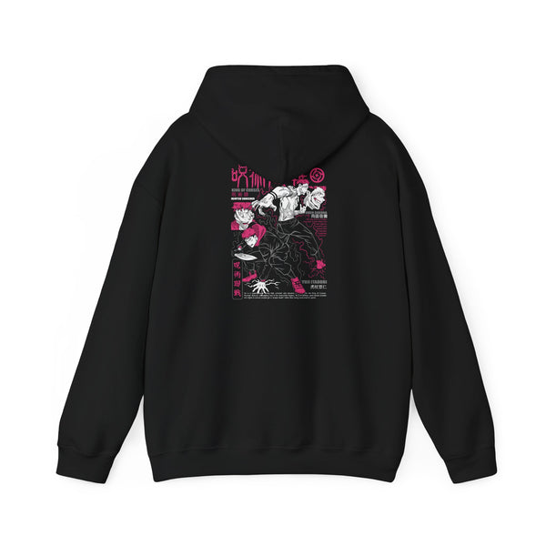 A relaxed, midweight hoodie that pairs streetwise edge with soft, wearable warmth. The front features a compact, stylized logotype in vivid pink, while the back displays a layered graphic—floral motifs, bold linework, and typographic elements—printed in high-contrast pink and white on deep black. The roomy kangaroo pocket and double-lined hood make it dependable for cool evenings, skate sessions, or slow coffee runs. It feels lived-in from the first wear yet holds its shape thanks to a balanced cotton/poly blend and resilient printing methods. Wear it over a tee or under a jacket; it brings quiet attitude and a touch of graphic drama to everyday movement.